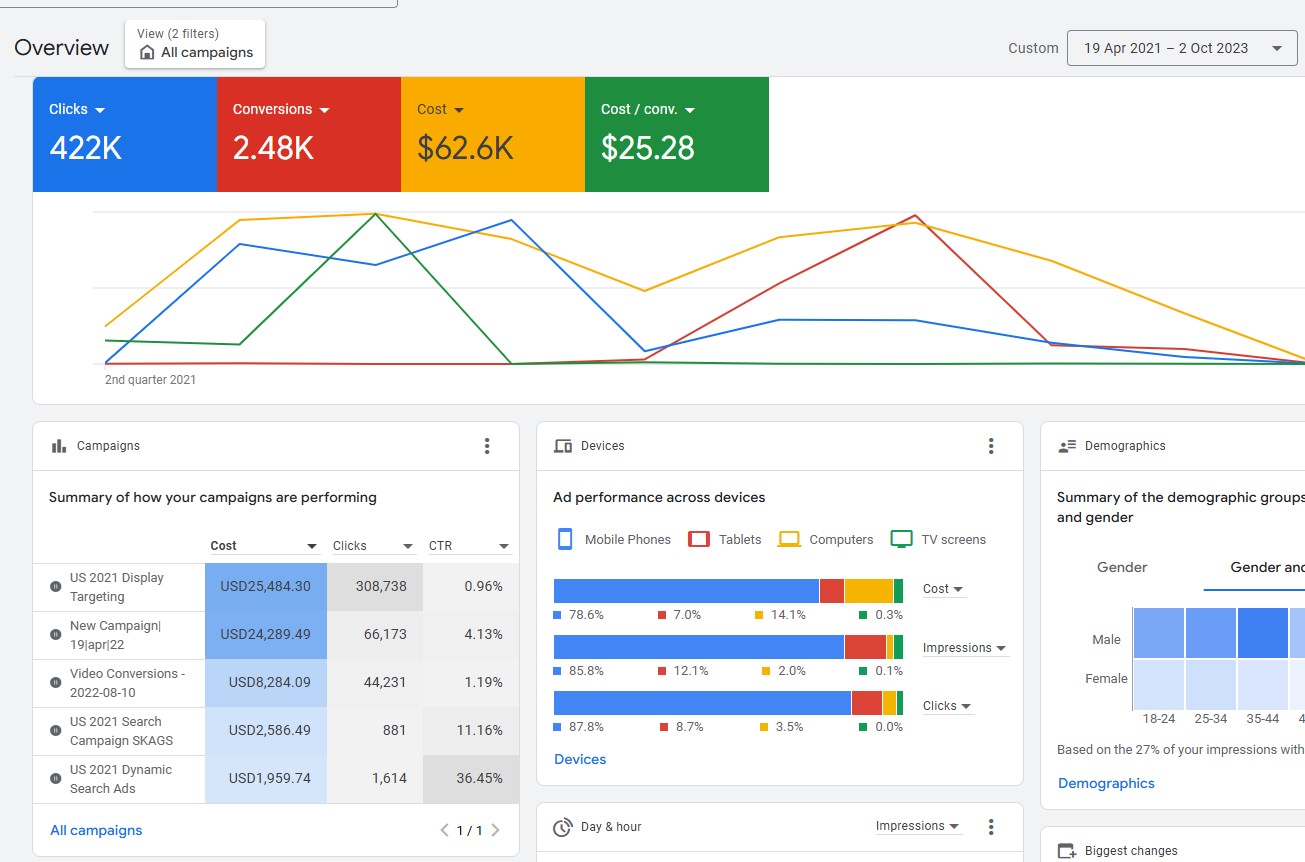 This Google Ads Management campaign achieved 212 Conversions and 2,696 Ad clicks to a professional services business over a 30 day campaign – at a cost effective ads budget of only $2,770.54 in a competitive industry.